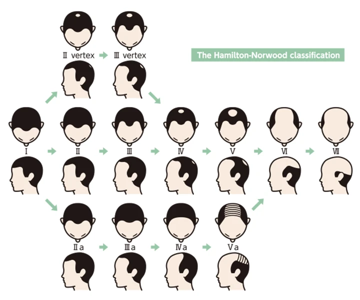 このAGAの進行パターンは、「ハミルトン・ノーウッド分類」と呼ばれる基準で分類されています。これは1942年にアメリカのノーウッド医師が改良したもので、今では薄毛の進行度を判断する一般的な目安として広く使われています。