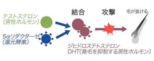 この原因のひとつが、男性ホルモンの一種「DHT(ジヒドロテストステロン)」の影響です。