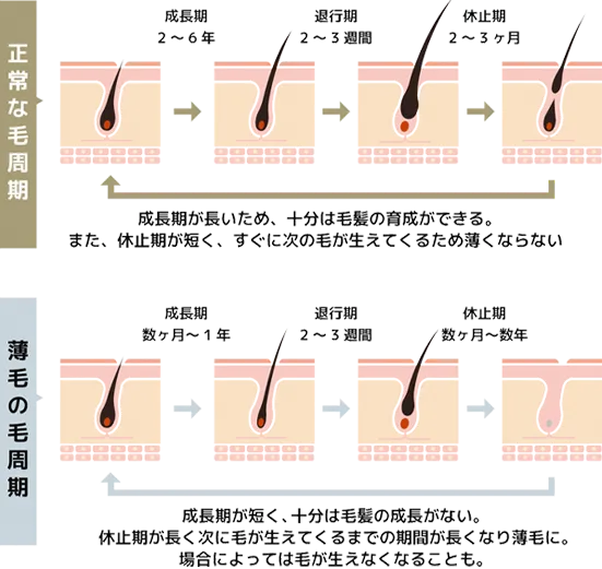 その結果、髪が「抜けるサイクル」が早まり、徐々にボリュームが減って薄毛が目立ってくるようになります。